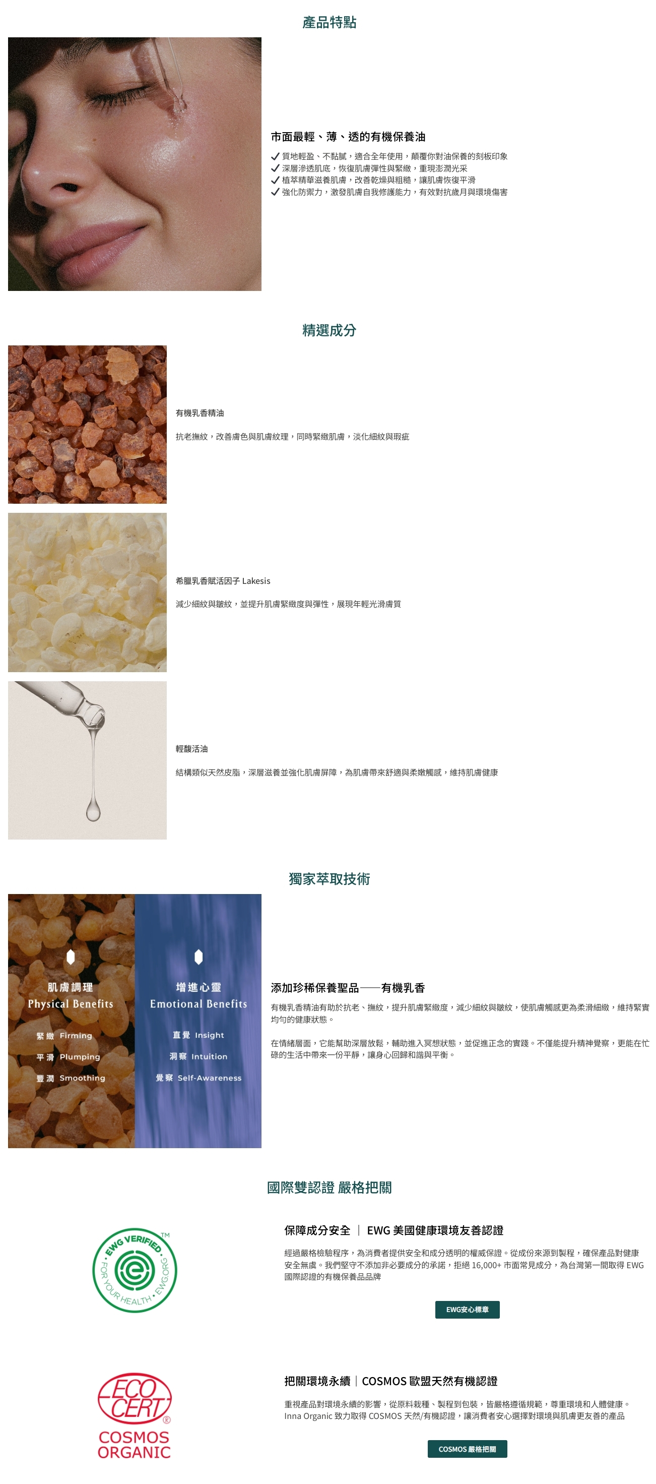 可深入肌底潤澤,緊緻撫紋,延緩肌膚衰老,做到輕、薄、透的質地,立即吸收的輕感精華油。容量:30ml ︳保存期限:新識別包裝自製造日 3 年,開封後 6 個月