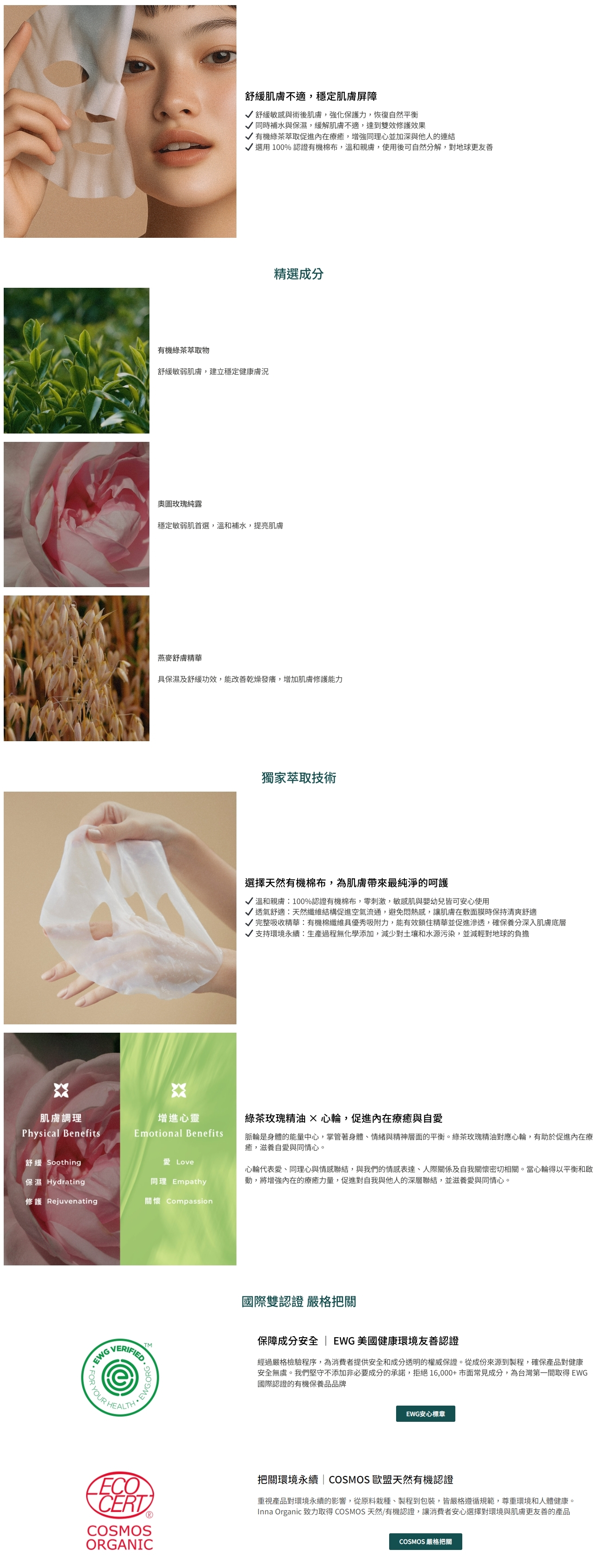 新版綠茶玫瑰穩膚純露面膜採用有機棉製成,溫和親膚,能讓肌膚更有效吸收,有效舒緩敏弱、術後肌膚,穩定肌膚屏障。
