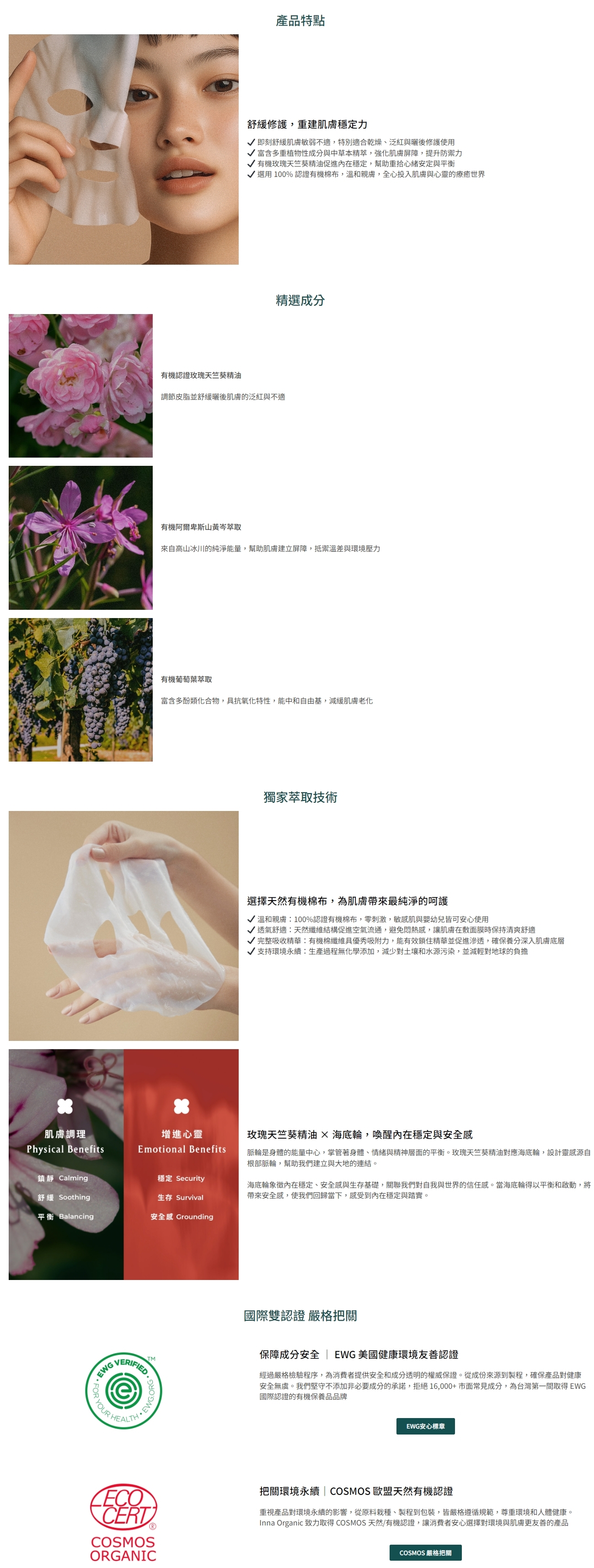 新版玫瑰天竺葵舒緩精油面膜採用有機棉製成,溫和親膚,能讓肌膚更有效吸收,有助舒緩敏弱、換季、乾燥泛紅及曬後的肌膚。面膜的設計靈感來自脈輪中的海底輪,有機玫瑰天竺葵精油可以促進內在穩定,加深與大地的深層聯繫和安全感。有機玫瑰天竺葵精油有助於舒緩肌膚;在心靈支持層面,它有助於我們與當下重新建立聯繫,並增強內心的安心和穩定。