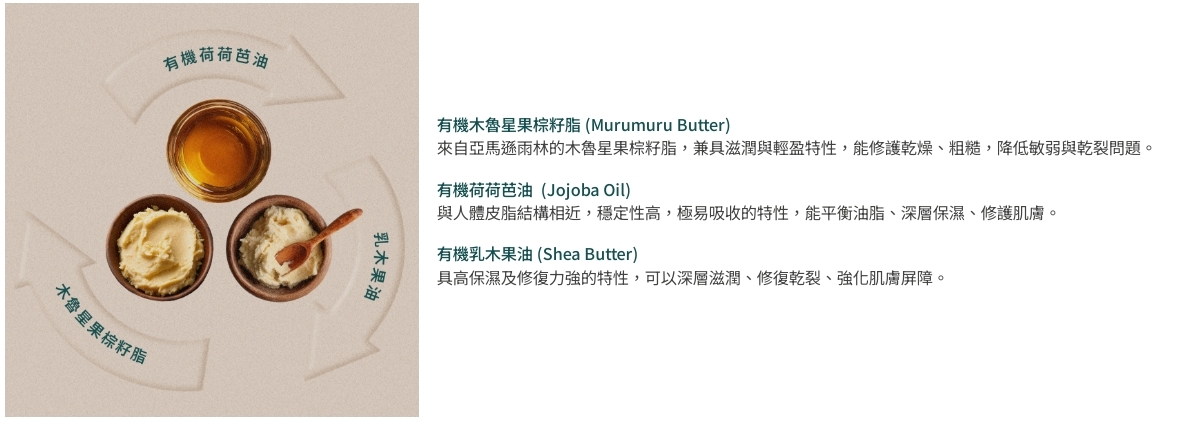 有機三大植物油黃金配比,可深層潤澤、強化屏障、防止乾裂。