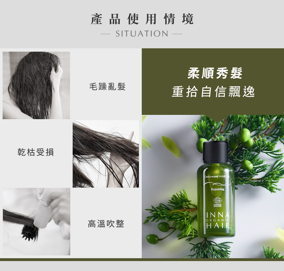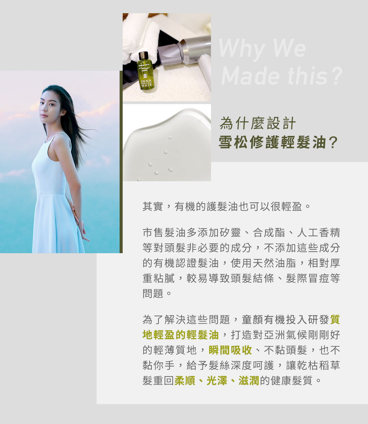 雪松修護輕髮油,選用與臉部精華油同等級的天然有機油脂,不需要添加矽靈、合成酯類、人工香精,依然可以打造輕、薄、透的質地,顛覆你對有機髮油的厚重印象。溫和呵護頭髮毛麟片,重現秀髮美麗光澤。