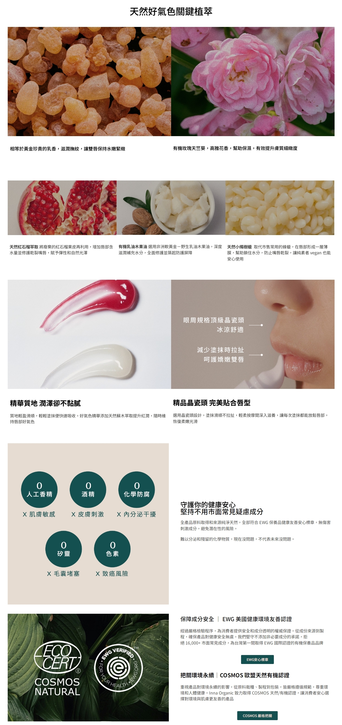 乳香撫紋潤唇精華:Sorbitan Olivate, Octyldodecanol, Ricinus Communis (Castor) Seed Oil*, Butyrospermum Parkii (Shea) Butter*, Helianthus Annuus (Sunflower) Seed Oil*, Simmondsia Chinensis (Jojoba) Seed Oil*, Prunus Amygdalus Dulcis (Sweet Almond) Oil*, Adansonia Digitata Seed Oil*, Punica Granatum Sterols, Euphorbia Cerifera (Candelilla) Wax, Boswellia Neglecta Resin Oil*, Tocopherol, Lavandula Angustifolia Oil*, Fusanus Spicatus Wood Oil*