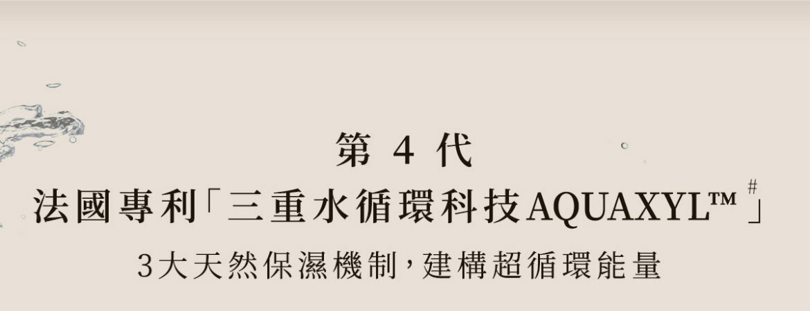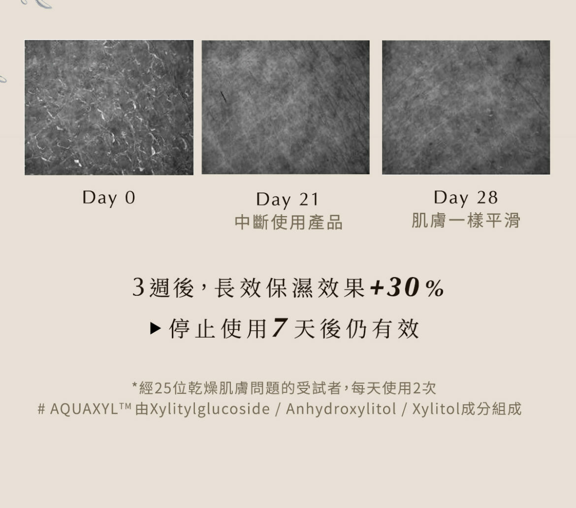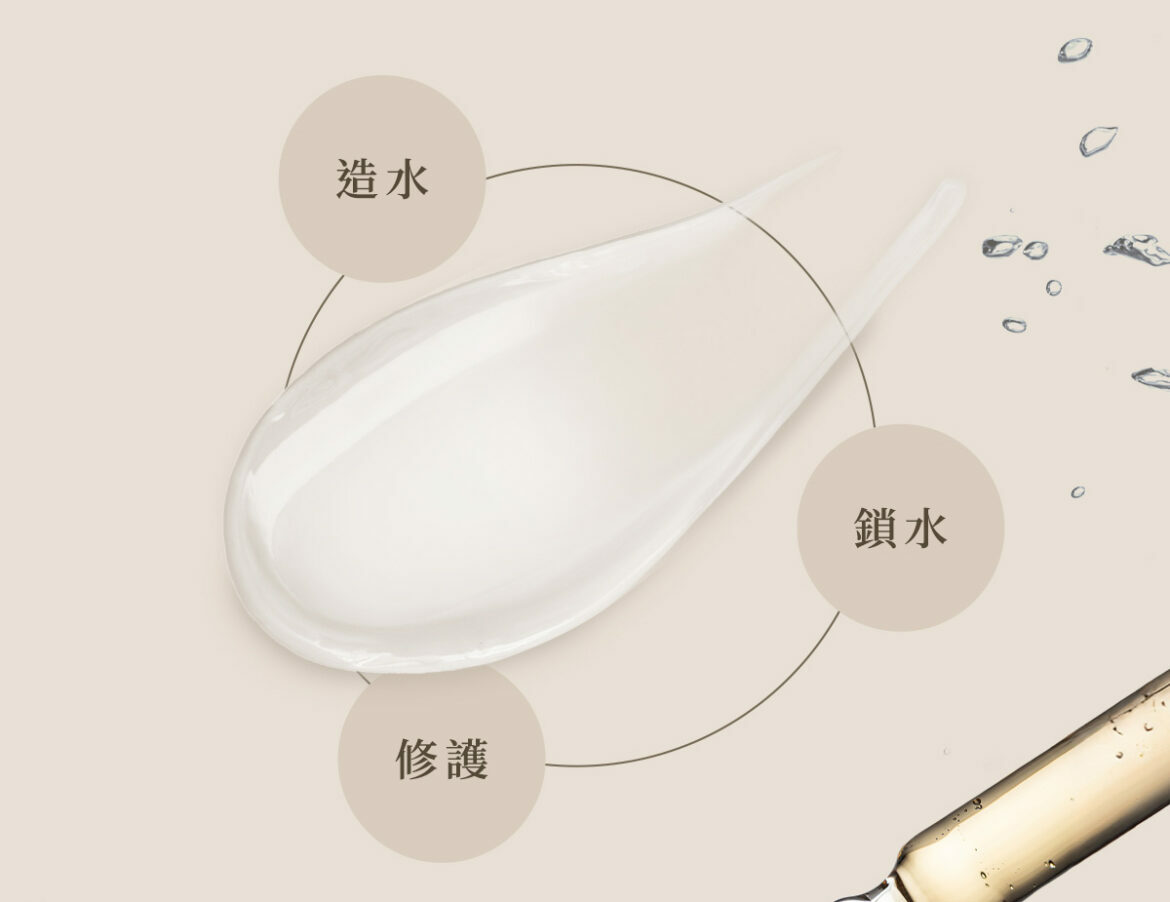 運用「超臨界沒藥鮮萃技術」天然植萃結合科技,淬煉保濕奇蹟結合第 4 代 法國專利「三重水循環科技 AQUAXYL™」打造不間斷:鎖水↔造水↔修護作用可搭配現有保養品使用純素(vegan)可用、無動物實驗容量。