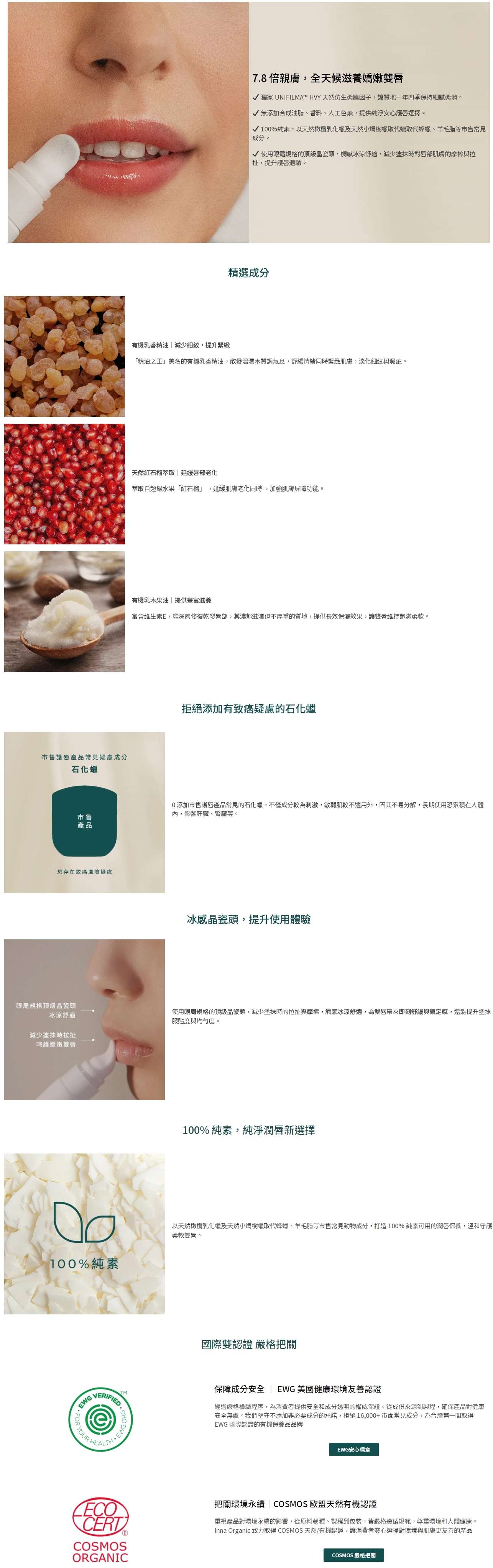 添加有機乳香精油及超級水果「紅石榴」萃取,撫平唇紋,延緩肌膚老化現象。